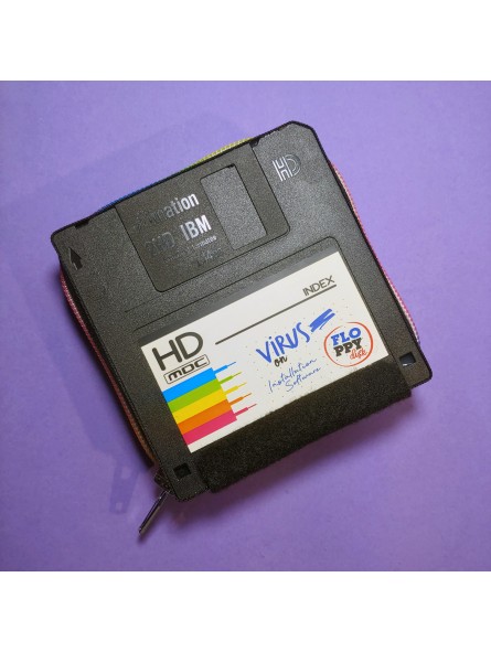 Monedero de disquete negro diseño Virus, color de cremallera multicolor.