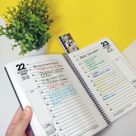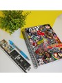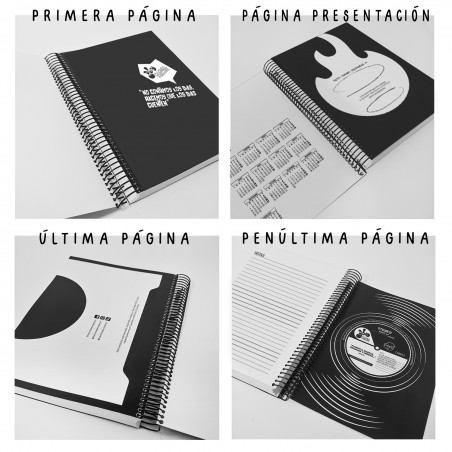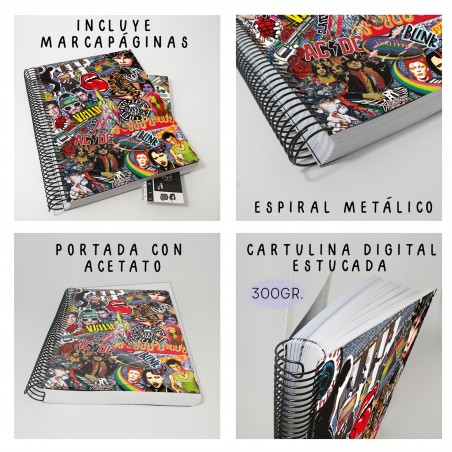 Agenda anual 2026 con portada diseño de stickers y bandas de rock clásico, grunge, metal, psicodélico, 70s, 80s, 90s, encuadernada con espiral, página día (Sábado y Domingo en páginas independientes) ideal para emprendedores y autónomos.