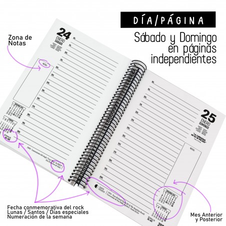 • PRODUCTO: Agenda anual 2026 cuyas tapas están hechas con discos de vinilo LP reales, contiene 400 páginas, semana organizada día por página (sábado y domingo en páginas independientes, ideal para emprendedores y autónomos), idioma español / inglés /catalán / gallego / euskera, diseño central a elección.