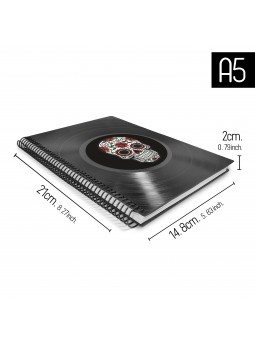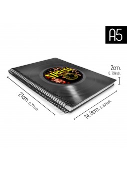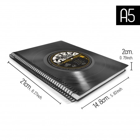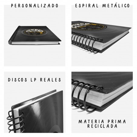 • FABRICACIÓN: Esta agenda anual esta hecha de forma artesanal, reciclando los antiguos discos de vinilo LP de 12", los discos están cortados en forma rectangular, para así darle la forma a la portada y la contraportada de la agenda. La encuadernación es de anillado con espiral metálico que le da un toque más casual, en su interior, contiene información, hoja de datos, calendarios...