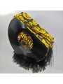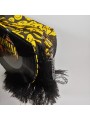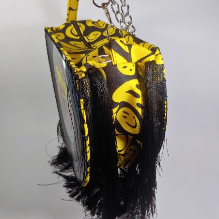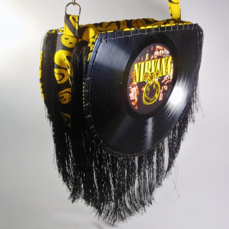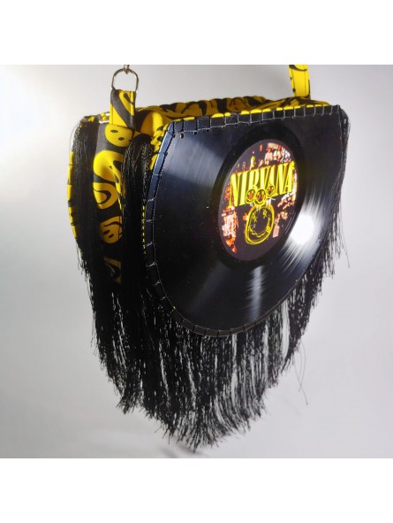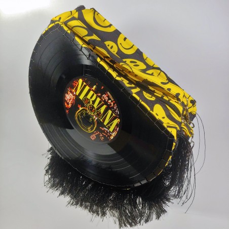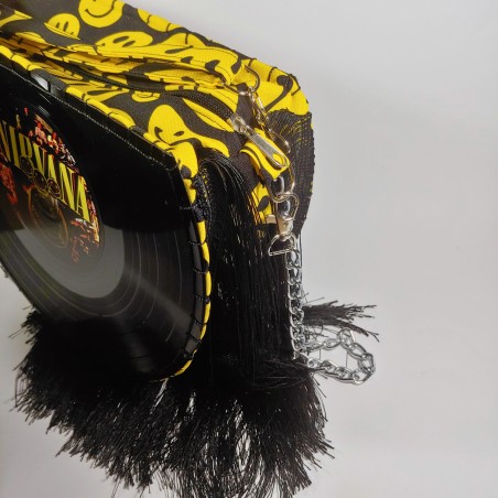Bolso de discos de vinilo mediano de 10" con 2 usos (de hombro o de mano), cadena con mosquetones para quitar y poner, diseño nirvana, tela caritas amarillas y flecos inferiores con estilo boho/chic a tono.