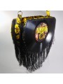 PRODUCTO: Bolso hecho con dos discos de vinilo de 10" o medianos reales cortados por la parte superior, cierre de cremallera, asa media para hombro con cinta de tela y cadena metalizada con mosquetones, tela a elección y flecos.