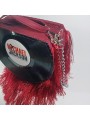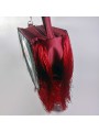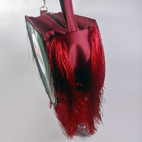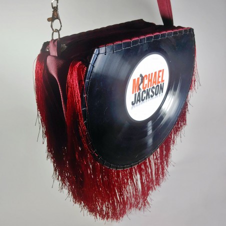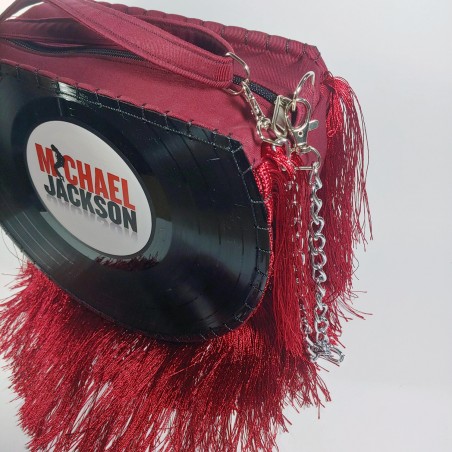 Bolso de discos de vinilo mediano de 10" con 2 usos (de hombro o de mano), cadena con mosquetones para quitar y poner, diseño Michael Jackson, tela granate y flecos inferiores con estilo boho/chic a tono.