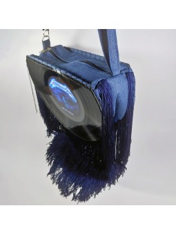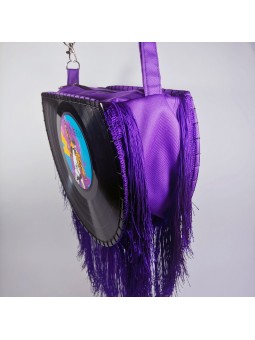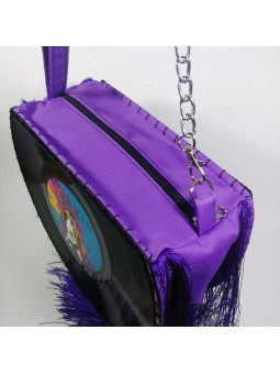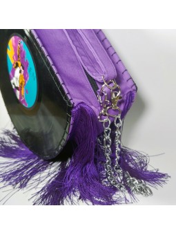 PRODUCTO: Bolso hecho con dos discos de vinilo de 10" o medianos reales cortados por la parte superior, cierre de cremallera, asa media para hombro con cinta de tela y cadena metalizada con mosquetones, tela a elección y flecos.