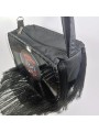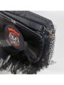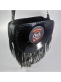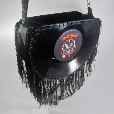 Bolso de discos de vinilo mediano de 10" con 2 usos (de hombro o de mano), cadena con mosquetones para quitar y poner, diseño Motorhead, tela negro y flecos inferiores con estilo boho/chic a tono.