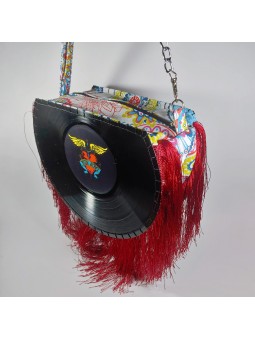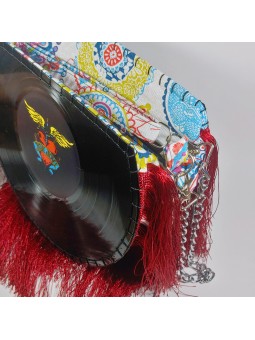 PRODUCTO: Bolso hecho con dos discos de vinilo de 10" o medianos reales cortados por la parte superior, cierre de cremallera, asa media para hombro con cinta de tela y cadena metalizada con mosquetones, tela a elección y flecos.