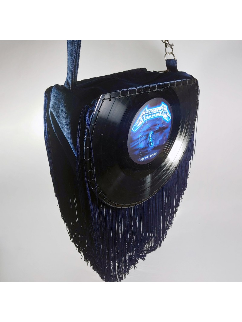 Bolso de discos de vinilo mediano de 10" con 2 usos (de hombro o de mano), cadena con mosquetones para quitar y poner, diseño Metallica, tela vaquera/tejana azul y flecos inferiores con estilo boho/chic a tono.