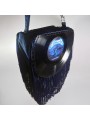 FABRICACIÓN: Este bolso esta hecho de forma artesanal, reciclando los antiguos discos de vinilo de 10", los discos están perforados y cosidos a mano a la tela elegida por todo su contorno, en la parte superior tenemos la cremallera, en su interior tiene solo un compartimento principal totalmente reforzado y forrado con tela negra, la asa esta hecha con cinta de nylon forrada con la tela elegida y parte de cadena metalizada con mosquetones para quitar y poner. Terminamos el producto con 2 líneas de flecos en la zona inferior a juego para darle movimiento y un estilo único. Este producto está diseñado, creado y fabricado en Europa, Made in Spain!