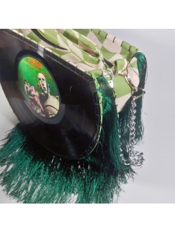 PRODUCTO: Bolso hecho con dos discos de vinilo de 10" o medianos reales cortados por la parte superior, cierre de cremallera, asa media para hombro con cinta de tela y cadena metalizada con mosquetones, tela a elección y flecos.
