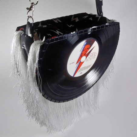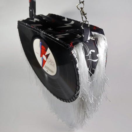 Bolso de discos de vinilo mediano de 10" con 2 usos (de hombro o de mano), cadena con mosquetones para quitar y poner, diseño Bowie, tela rayitos y flecos inferiores con estilo boho/chic a tono.