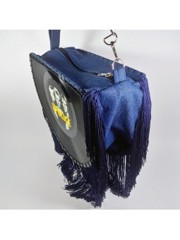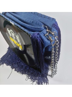 PRODUCTO: Bolso hecho con dos discos de vinilo de 10" o medianos reales cortados por la parte superior, cierre de cremallera, asa media para hombro con cinta de tela y cadena metalizada con mosquetones, tela a elección y flecos.
