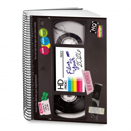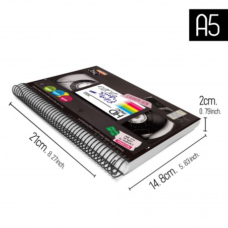 Cuaderno con portada con diseño de una cinta de VHS con las típicas pegatinas que llevaban como cuando la alquilabas en un videoclub, encuadernada con espiral metálico negro, interior de 150 hojas blancas de 90gr.