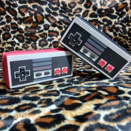 Dúo de monederos (uno rojo y otro negro) de un compartimento hecho a mano con mandos de consola retro, botones pulsables, cremallera y tirador níquel, interior con solapas y forrado.