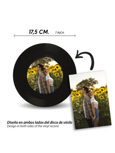 Vinilo SINGLE (pequeño) de 7" (17,5cm.) personalizado con la imagen que tu quieras pegada en ambos lados del vinilo.