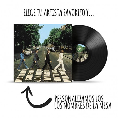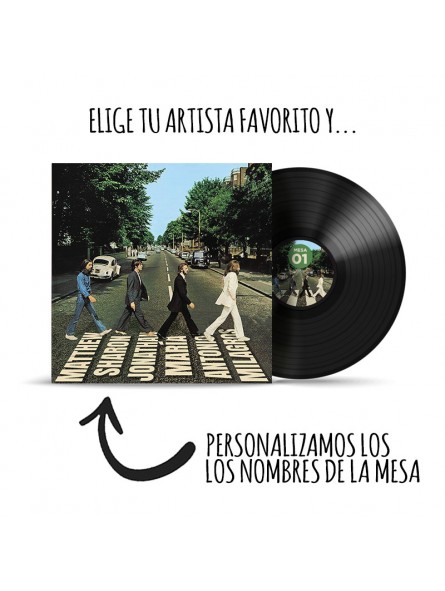 - En el disco de vinilo pondremos la foto que nos adjuntes y el número de la mesa elegida.