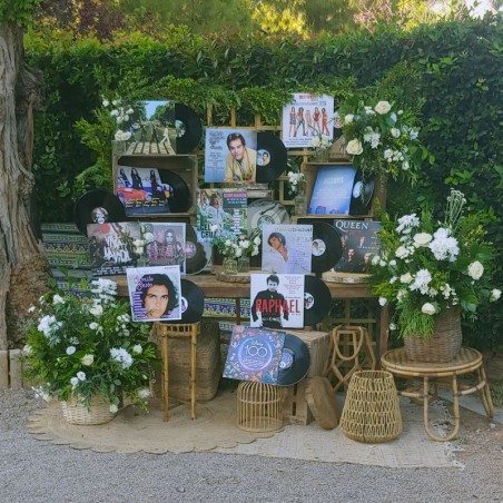 - El disco de vinilo incluido es real reciclado que por algún defecto ya no pueden ser utilizados para escuchar música, así le damos una segunda oportunidad a estos discos para que forme parte de tu seating plan o para que le des el uso que tu quieras.