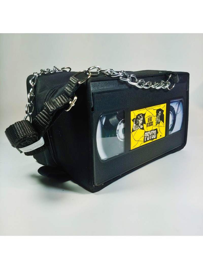 PRODUCTO: Bolso hecho con una cinta de video VHS real, cierre de cremallera, asa larga con regulador de altura y cadena metálica, tela y pegatina de película.