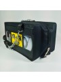 FABRICACIÓN: Este bolso esta hecho de forma artesanal, reciclando los antiguos videos VHS, la tela envuelve todo el contorno de la cinta VHS, en la parte superior y laterales tenemos la cremallera, en su interior tiene un compartimento principal totalmente reforzado y forrado con tela negra, con solapas en los laterales para que no se caiga el contenido, las asas están hechas con cinta de nylon negra cuya altura podrás regular a tu deseo y con cadena metálica. Diseñado y fabricado en España.