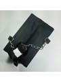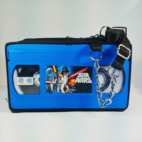 PRODUCTO: Bolso hecho con una cinta de video VHS real, cierre de cremallera, asa larga con regulador de altura y cadena metálica, tela y pegatina de película.