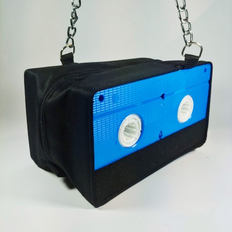 FABRICACIÓN: Este bolso esta hecho de forma artesanal, reciclando los antiguos videos VHS, la tela envuelve todo el contorno de la cinta VHS, en la parte superior y laterales tenemos la cremallera, en su interior tiene un compartimento principal totalmente reforzado y forrado con tela negra, con solapas en los laterales para que no se caiga el contenido, las asas están hechas con cinta de nylon negra cuya altura podrás regular a tu deseo y con cadena metálica. Diseñado y fabricado en España.