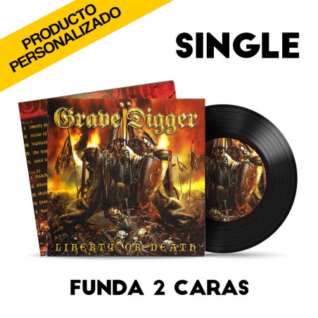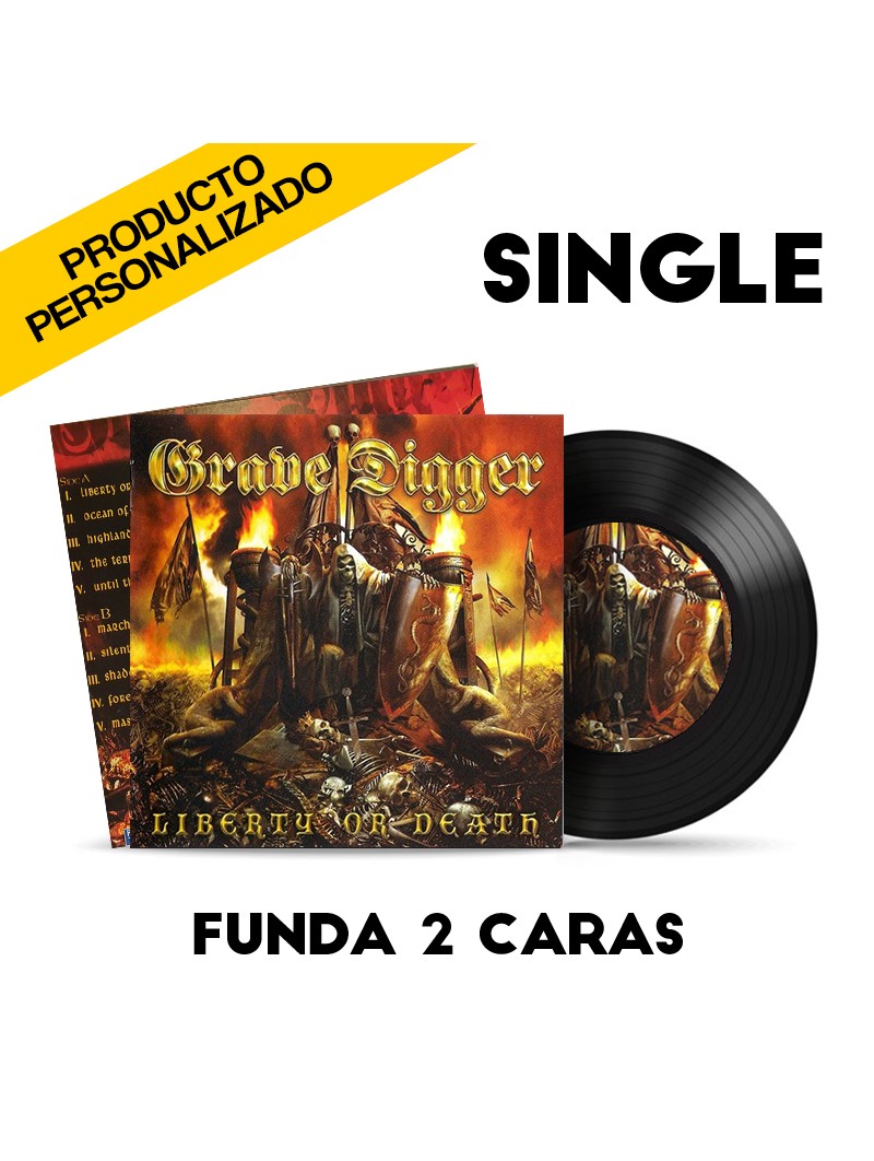 Funda de Vinilo SINGLE impresa a 2 caras + Vinilo SINGLE con pegatina en ambos lados.