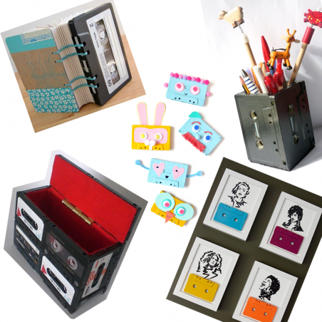 Decoración del Hogar: Embellece jarrones, lámparas o cualquier objeto del hogar. El cassette puede ser anclada con bridas alrededor del objeto o pegadas con silicona para darles una apariencia retro y nostálgica.