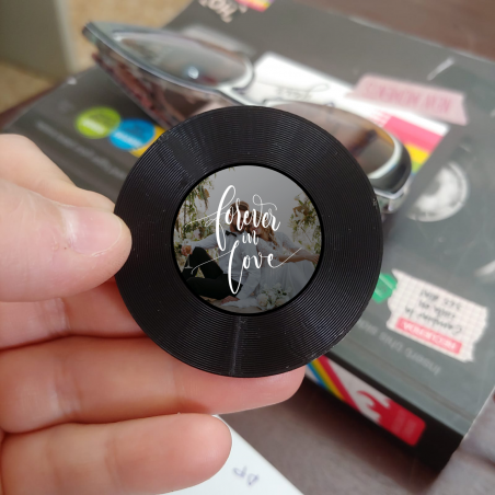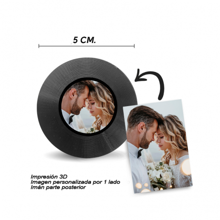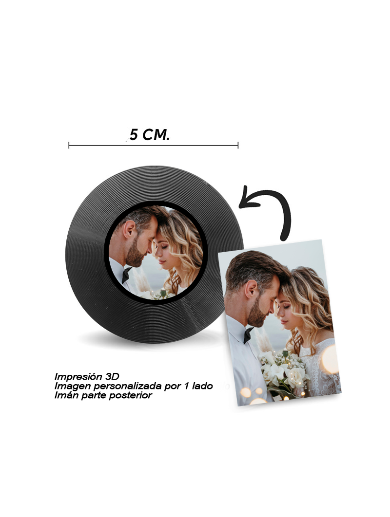 En este producto puedes personalizar tu Mini vinilo realizado con la textura de un vinilo real en impresión 3D (pequeño) de 5cm. con la imagen que tu quieras pegada en uno de los lados del vinilo y en el otro va una laminita de imán para la nevera.