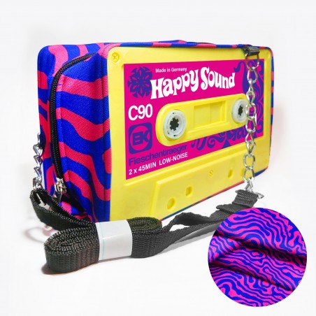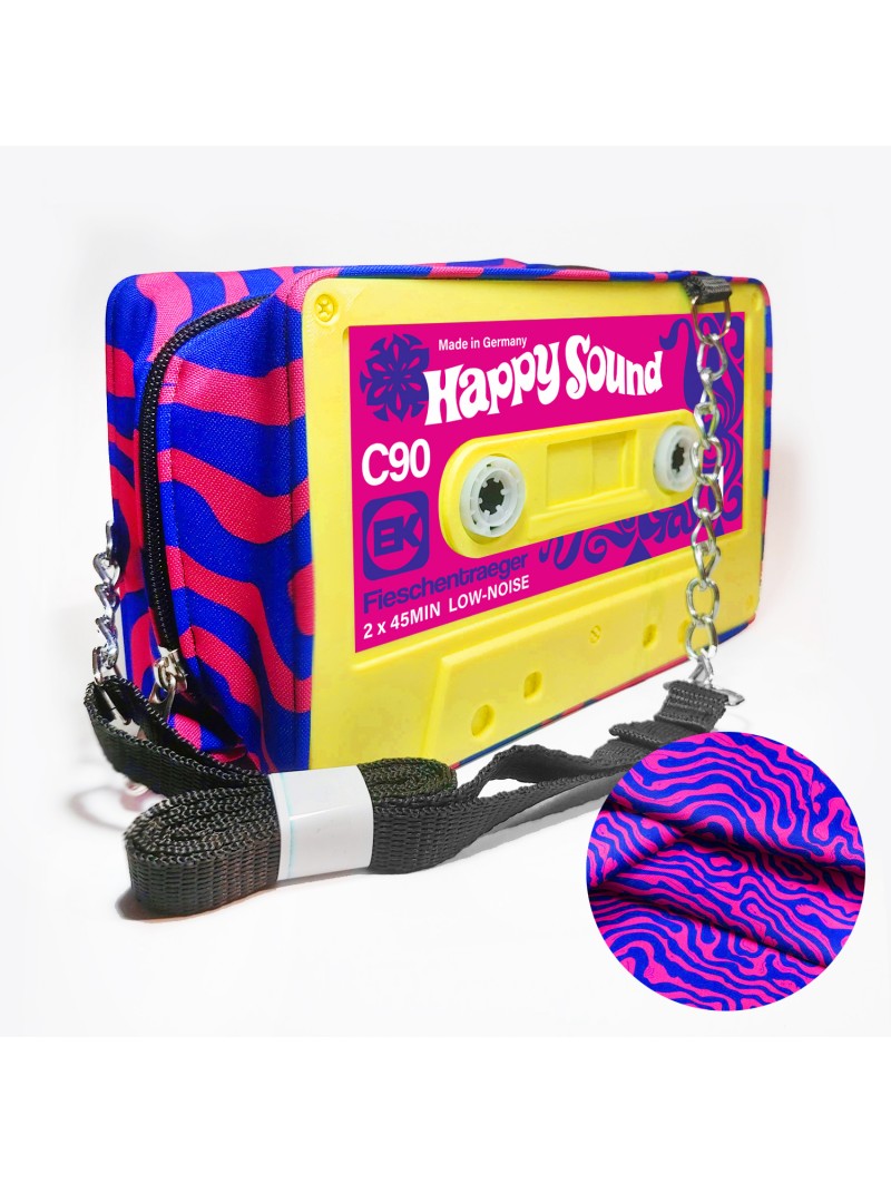 Bolso de cassette con cadena diseño Happy Sound, tela de ondas fucsias y azules.