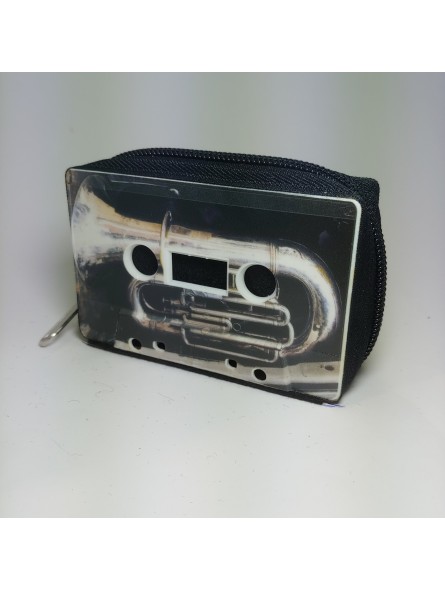 Monedero de cassette diseño único mostrado en imágenes. Tiene ligeros desperfectos estéticos que no influyen en su función principal.