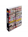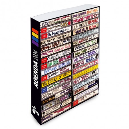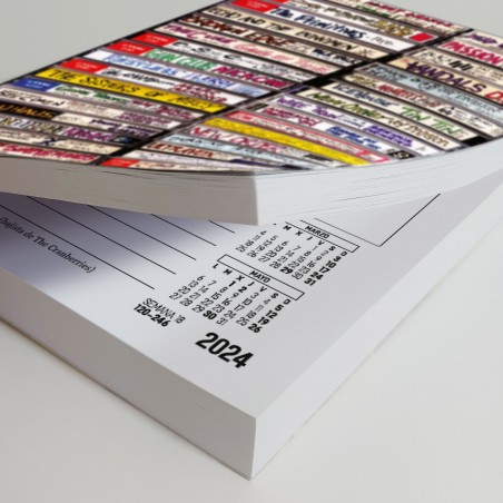 Agenda anual 2024 con portada diseño de cassettes apilados dibujados a mano alzada, encuadernada tipo libro, página día (Sábado y Domingo en páginas independientes).